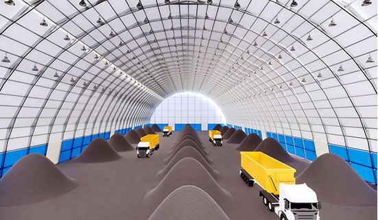 麗日生產的鋁合金結構封閉式的新型儲煤棚是響應國家環(huán)保政策的舉措,高性能鋁合金可讓儲煤棚結構更加穩(wěn)固耐用,而表面覆膜PVDF技術的PVC篷布也具備表面抗?jié)B吸、自潔性,可保證長久良好的使用狀態(tài)。內部采用無中柱大空間結構設計,很大程度的提高室內空間利用率,而且麗日篷房提供的拱形結構儲煤棚最大可做到跨度80米,頂高35米,這樣的大空間結構優(yōu)勢可方便貨車進出自由卸貨無困難。