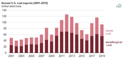 根據(jù)美國能源信息署的年度煤炭報告,2019年美國 煤炭出口下降至9300萬短噸,比上年下降20%。美國出口了冶金煤和動力煤,2019年兩者均下降。美國動力煤出口受全球煤炭需求下降的影響,較2018年下降了30%;冶金煤的跌幅較為溫和,為12%。
