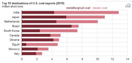 2019年,印度,日本,荷蘭,巴西和韓國是美國煤炭出口的五大目的地。這些國家合起來占美國煤炭出口總量的53%。