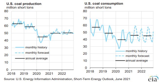 6月8日,美國能源信息署(EIA)發(fā)布《短期能源展望》(Short-Term Energy Outlook)顯示,2021年,美國煤炭產(chǎn)量預(yù)計(jì)將達(dá)到6億短噸(5.44億噸),較2020年實(shí)際產(chǎn)量增加6100萬短噸,增長11%。
