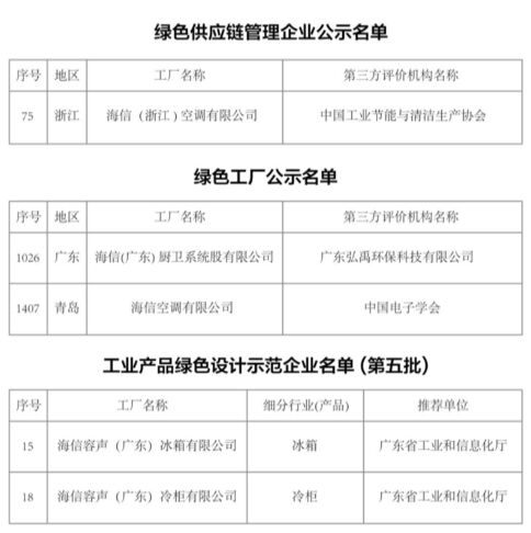 近日,工業(yè)和信息化部公示了2023年度綠色制造名單,海信空調有限公司、海信(廣東)廚衛(wèi)系統(tǒng)股份有限公司入選國家綠色工廠;海信(浙江)空調有限公司入選國家綠色供應鏈管理企業(yè)。在工信部第五批工業(yè)產品綠色設計示范企業(yè)名單中,海信容聲(廣東)冰箱有限公司、海信容聲(廣東)冷柜有限公司同樣榜上有名。至此,海信家電累計已有國家級綠色工廠7個、國家綠色供應鏈2個、國家級工業(yè)產品綠色設計示范企業(yè)5個、省級綠色工廠4個,數(shù)量及覆蓋率處于行業(yè)領先地位。