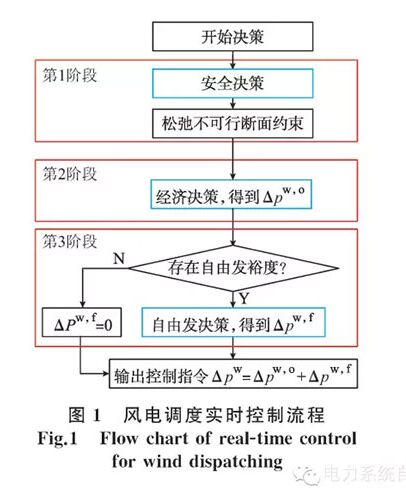 1、為什么要進(jìn)行1分鐘級(jí)的風(fēng)電調(diào)度實(shí)時(shí)控制? 風(fēng)資源的強(qiáng)隨機(jī)性、預(yù)測(cè)困難、反調(diào)峰等特點(diǎn)使得電網(wǎng)有功調(diào)度控制愈加困難。如何在保證電網(wǎng)安全的前提下, 最大程度利用風(fēng)電資源, 盡可能多地消納風(fēng)電已經(jīng)成為目前各個(gè)風(fēng)電基地面臨的共同挑戰(zhàn)之一。 目前, 業(yè)界已經(jīng)對(duì)風(fēng)電有功調(diào)度控制進(jìn)行了大量研究和工程實(shí)踐,初步形成了日前、小時(shí)前、分鐘前的多時(shí)間尺度時(shí)序遞進(jìn)滾動(dòng)調(diào)度控制模式。但是, 在傳統(tǒng)模式下, 風(fēng)電出力存在的分鐘級(jí)較大幅度快速波動(dòng), 只能由AGC機(jī)組和網(wǎng)間聯(lián)絡(luò)線來平衡, 給電網(wǎng)安全經(jīng)濟(jì)調(diào)度帶來較大壓力。為此, 本文引入更加快速的1分鐘級(jí)實(shí)時(shí)控制環(huán)節(jié), 其主要任務(wù)是根據(jù)當(dāng)前電網(wǎng)AGC機(jī)組的下旋備裕度和聯(lián)絡(luò)線計(jì)劃實(shí)際值與設(shè)定值的偏差, 在線確定電網(wǎng)當(dāng)前最大可消納的風(fēng)力發(fā)電能力, 然后根據(jù)各風(fēng)電場(chǎng)上送的實(shí)際出力和最大可發(fā)電能力預(yù)估值, 進(jìn)行分鐘級(jí)控制決策, 實(shí)時(shí)修正各風(fēng)電場(chǎng)的有功出力計(jì)劃值, 保障電網(wǎng)安全, 并減少不必要的棄風(fēng)損失。 2、風(fēng)電調(diào)度實(shí)時(shí)控制的主要挑戰(zhàn)是什么? ①如何保電網(wǎng)安全? 調(diào)峰能力和斷面安全是電網(wǎng)制約風(fēng)電消納的兩大關(guān)鍵因素。保證系統(tǒng)安全性是風(fēng)電調(diào)度實(shí)時(shí)控制的主要目標(biāo); ②如何減少棄風(fēng)損失? 在保證電網(wǎng)安全的基礎(chǔ)上, 如何充分利用已有風(fēng)電資源, 減少棄風(fēng)損失, 是風(fēng)電調(diào)度實(shí)時(shí)控制的次要目標(biāo); ③如何兼顧風(fēng)電場(chǎng)間的調(diào)度公平? 系統(tǒng)內(nèi)存在多個(gè)風(fēng)電場(chǎng)參與調(diào)度控制, 存在多種風(fēng)電場(chǎng)控制策略組合能實(shí)現(xiàn)電網(wǎng)安全和最小棄風(fēng), 如何選擇一種對(duì)于各風(fēng)電場(chǎng)盡可能公平的控制策略, 是確保風(fēng)電調(diào)度實(shí)時(shí)控制公平性的關(guān)系所在。 3、如何實(shí)現(xiàn)1分鐘級(jí)的風(fēng)電調(diào)度分階段決策? 本文引入了分階段決策模型, 根據(jù)先安全、后經(jīng)濟(jì)再公平的原則, 進(jìn)行分階段求解保證系統(tǒng)總是可以得到合理有效解, 如下圖所示。