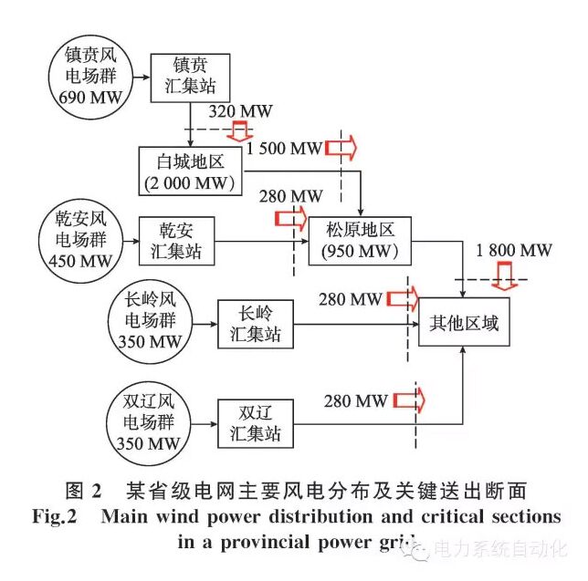 約束條件包括風(fēng)電送出斷面可行約束、電網(wǎng)可消納風(fēng)電能力約束、引入自由發(fā)控制方向約束、風(fēng)電場(chǎng)容量約束等。 4、系統(tǒng)研制及實(shí)際效果如何? 基于本文方法研制的實(shí)際系統(tǒng)已經(jīng)實(shí)際應(yīng)用, 下圖分別為電網(wǎng)結(jié)構(gòu)及控制系統(tǒng)結(jié)構(gòu):