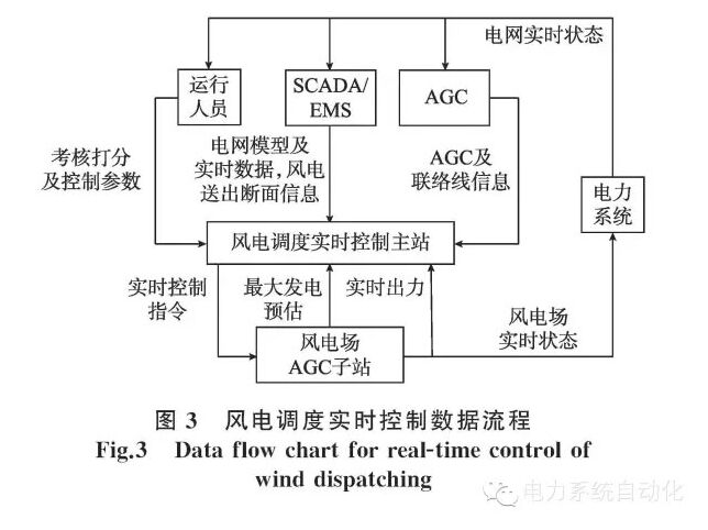 可以看出: ①當(dāng)電網(wǎng)無風(fēng)電接納空間內(nèi), 限制風(fēng)電出力, 確保安全; ②反之, 恢復(fù)風(fēng)電, 提高風(fēng)電利用率; ③并提供自由發(fā)模式, 減少由于風(fēng)電預(yù)測(cè)偏差導(dǎo)致的不必要棄風(fēng); ④電網(wǎng)優(yōu)先利用打分值較高對(duì)電網(wǎng)更加友好的風(fēng)電資源。 5、工作總結(jié)及進(jìn)一步工作: 本文提出并實(shí)現(xiàn)分階段風(fēng)電調(diào)度實(shí)時(shí)控制模型及決策流程。通過第一階段的斷面越限校正控制, 辨識(shí)并松弛不可能的風(fēng)電送出斷面約束, 通過第二階段的最小棄風(fēng)控制, 最大消納風(fēng)電并兼顧風(fēng)場(chǎng)間的公平調(diào)度, 通過第三階段的自由發(fā)決策, 進(jìn)一步降低棄風(fēng)可能,進(jìn)行標(biāo)準(zhǔn)算例仿真, 并結(jié)合現(xiàn)場(chǎng)實(shí)際, 研發(fā)1分鐘級(jí)的風(fēng)電調(diào)度實(shí)際控制功能。仿真結(jié)果和實(shí)際結(jié)果證明了本文方法的有效性和可靠性。 作為多時(shí)間尺度風(fēng)電消納框架的重要組成部分, 本文重點(diǎn)闡述在1分鐘級(jí)時(shí)間維度上風(fēng)電場(chǎng)之間、風(fēng)電場(chǎng)與常規(guī)AGC機(jī)組之間的協(xié)調(diào)控制。至于在更長(zhǎng)時(shí)間尺度上考慮風(fēng)電場(chǎng)、AGC機(jī)組與常規(guī)較慢速機(jī)組之間的協(xié)調(diào), 充分挖掘電網(wǎng)和常規(guī)電源的調(diào)節(jié)能力, 使得電網(wǎng)保留足夠調(diào)節(jié)空間來接納風(fēng)電是后續(xù)研究重點(diǎn)。