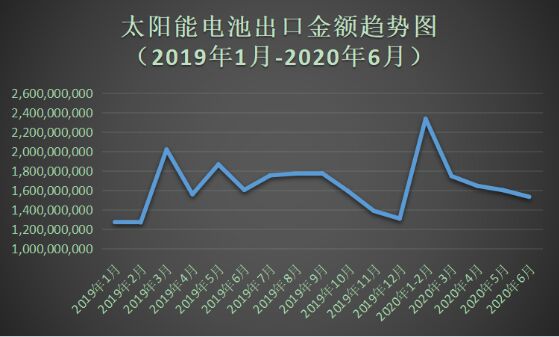據(jù)海關(guān)數(shù)據(jù)顯示,2020年6月中國太陽能電池出口數(shù)量為2.3億個(gè),同比增長11.37%;1-6月太陽能電池累計(jì)出口數(shù)量為13.2億個(gè),較去年同期增長29.64%。2020年6月中國太陽能電池出口金額為15.3億美元,同比下跌4.42%;1-6太陽能電池累計(jì)出口金額88.5億美元,較去年同期下跌7.59%。 從2020年上半年出口數(shù)據(jù)上看,我國太陽能電池整體出口量持續(xù)增長。其中,1-3月出口量較為穩(wěn)定,4-5月受海外疫情影響,出口量表現(xiàn)低迷,6月隨著全球大部分國家復(fù)工復(fù)產(chǎn),出口數(shù)據(jù)獲得上漲,出口形勢逐漸好轉(zhuǎn)。與此同時(shí),太陽能電池出口金額卻呈現(xiàn)出下降趨勢,反映出我國太陽能電池出口價(jià)格持續(xù)下降。