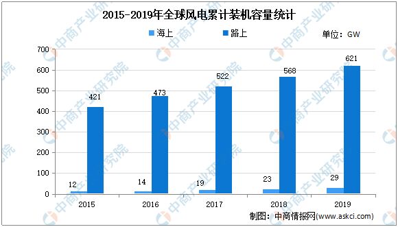 近年來(lái),在陸上風(fēng)電發(fā)展趨于穩(wěn)定的同時(shí),海上風(fēng)電呈現(xiàn)了高速發(fā)展的趨勢(shì)。截至2019年,全球風(fēng)電累計(jì)裝機(jī)容量為650吉瓦。其中,陸上風(fēng)電累計(jì)裝機(jī)容量為621吉瓦,海上風(fēng)電累計(jì)裝機(jī)容量為29吉瓦;與2008年相比,陸上風(fēng)電累計(jì)裝機(jī)容量年均復(fù)合增長(zhǎng)率為16.21%、海上風(fēng)電累計(jì)裝機(jī)容量年均復(fù)合增長(zhǎng)率為35.81%。