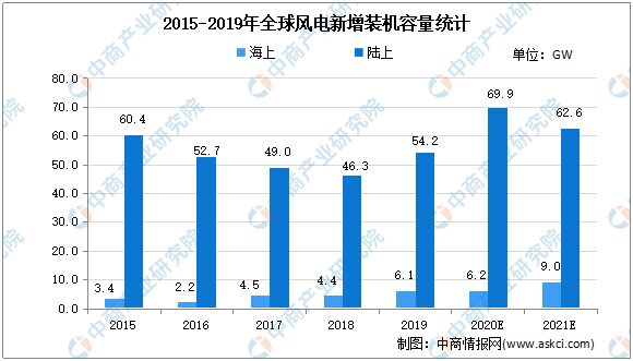 近年來(lái),世界各國(guó)對(duì)能源安全、生態(tài)環(huán)境、氣候變化等問(wèn)題的日益重視,加快發(fā)展風(fēng)電產(chǎn)業(yè)已成為國(guó)際社會(huì)推動(dòng)能源轉(zhuǎn)型發(fā)展、應(yīng)對(duì)全球氣候變化的普遍共識(shí)和一致行動(dòng)。數(shù)據(jù)顯示,2019年全球風(fēng)電新增裝機(jī)容量60.4吉瓦,同比增長(zhǎng)19.13%。其中,陸上風(fēng)電新增裝機(jī)容量54.2吉瓦,同比增長(zhǎng)17.06%,海上風(fēng)電新增裝機(jī)容量6.1吉瓦,同比增長(zhǎng)38.64%。未來(lái)五年,全球風(fēng)電行業(yè)將延續(xù)發(fā)展趨勢(shì),風(fēng)電新增裝機(jī)容量可達(dá)355吉瓦,年均復(fù)合增長(zhǎng)率將達(dá)到4%,海上風(fēng)電裝機(jī)容量將持續(xù)快速增長(zhǎng)。