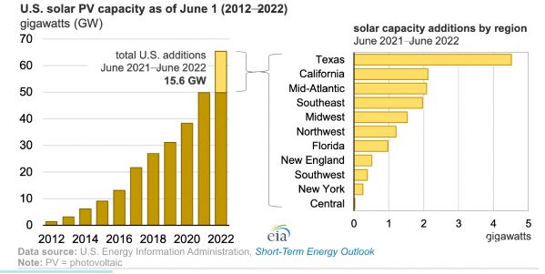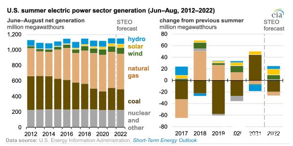 據美國能源信息署2022年5月發(fā)布的《夏季電力展望》報告,預計今年夏季美國電力部門發(fā)電量的最大增長將來自可再生能源。2022年6月至8月,公用事業(yè)規(guī)模的太陽能發(fā)電量將比去年夏天同期增長1000萬兆瓦時,風力發(fā)電量將增長800萬兆瓦時;而今年夏天煤炭和天然氣發(fā)電量將減少2600萬兆瓦時。