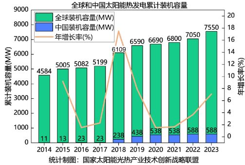 隨著我國新型能源體系、新型電力系統(tǒng)加快建設(shè),兼具調(diào)峰電源和儲(chǔ)能雙重功能的太陽能熱發(fā)電行業(yè)迎來了新發(fā)展機(jī)遇。1月18日發(fā)布的《中國太陽能熱發(fā)電行業(yè)藍(lán)皮書2023》(以下簡稱《藍(lán)皮書》)顯示,截至2023年底,我國兆瓦級(jí)規(guī)模以上光熱發(fā)電機(jī)組累計(jì)裝機(jī)容量588MW(兆瓦),在全球太陽能熱發(fā)電累計(jì)裝機(jī)容量中占比7.8%。