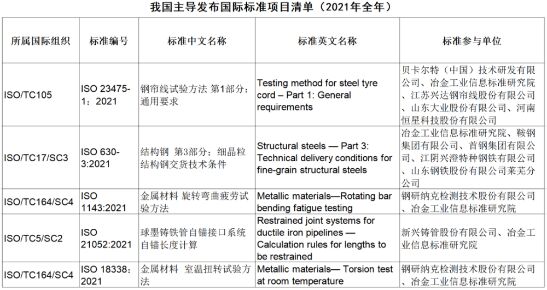 2022年3月8日,市場監(jiān)管總局標(biāo)準(zhǔn)創(chuàng)新管理司公開了2021年ISO發(fā)布的由我國牽頭制修訂的國際標(biāo)準(zhǔn)情況。其中,鋼鐵領(lǐng)域2021年主導(dǎo)發(fā)布了5項國際標(biāo)準(zhǔn)。