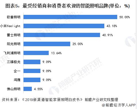 行業(yè)競爭逐漸激烈 2011年國家發(fā)改委等五部委發(fā)布了“中國逐步淘汰白熾燈路線圖”,提出白熾燈淘汰步驟。隨后,2015年2月份,亞明、陽光、鴻雁、歐普、飛利浦、木林森、科瑞、銳高、瑩輝、柏年、鼎暉、頓格等13家企業(yè)與結(jié)盟,簽訂了《共建智能照明聯(lián)合聲明》,抱團(tuán)推廣智能照明。另一邊,照明企業(yè)也在謀求和互聯(lián)網(wǎng)企業(yè)的合作。2016年,與華為開始戰(zhàn)略合作,并在華為HiLink智慧家庭生態(tài)發(fā)布會(huì)上發(fā)布了合作后的首批產(chǎn)品。智能也和鴻雁電器達(dá)成合作。 根據(jù)智哪兒、、雷士照明、昕諾飛、涂鴉智能、上海聯(lián)通、華藝廣場、億美光電等一線單位和近20家的相關(guān)企業(yè)聯(lián)合編制的《2019新渠道智能家居照明白皮書》顯示,目前中國主要的智能照明品牌有歐普照明、小米Yeelight、雷士照明、陽光照明、飛利浦照明等,在《2019新渠道智能家居照明白皮書》調(diào)研中,上述品牌在“最受經(jīng)銷商和消費(fèi)者歡迎的智能照明品牌”選項(xiàng)中占比分別為50%、43.18%、40.91%、25%、13.64%。 此外,在智能家居照明領(lǐng)域,阿里、騰訊、小米、海爾等互聯(lián)網(wǎng)、家電企業(yè)也跨界而來,開始照明設(shè)計(jì)和照明銷售,試圖打造自己的智能生態(tài)圈。