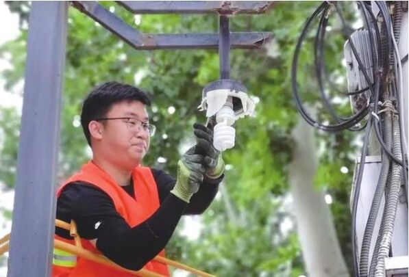 工作人員檢修維護(hù)市政照明景觀燈。