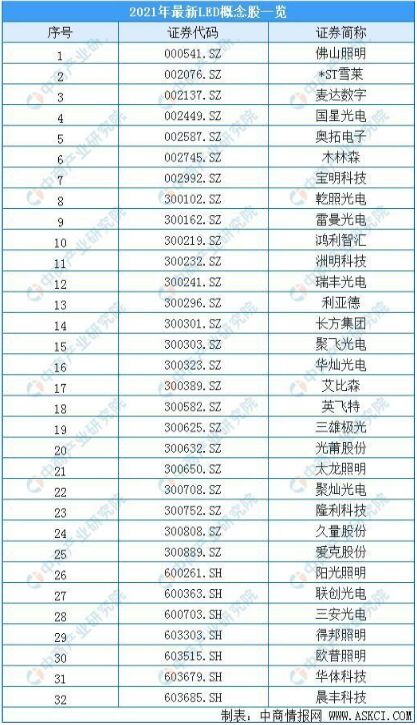 從相關(guān)概念企業(yè)來(lái)看,截至2021年1月13日,LED概念企業(yè)主要有以下32家: