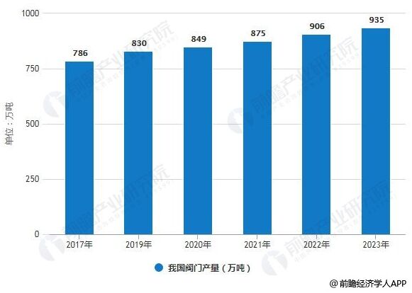 2019年中國閥門行業(yè)產(chǎn)量分析預(yù)測 據(jù)前瞻產(chǎn)業(yè)研究院發(fā)布的《中國閥門制造行業(yè)產(chǎn)銷需求預(yù)測與轉(zhuǎn)型升級分析報告》統(tǒng)計數(shù)據(jù)顯示,2017年中國閥門產(chǎn)量已達786萬噸,同比增長2.77%。截止至2018年上半年我國閥門進口量為51126萬套,同比增長25.1%。上半年我國閥門進口金額為3632百萬美元,同比下降0.5%。預(yù)測2019年我國閥門產(chǎn)量將達到830萬噸,未來五年(2019-2023)年均復(fù)合增長率約為3.02%,并預(yù)測在2023年我國閥門產(chǎn)量將達到935萬噸。