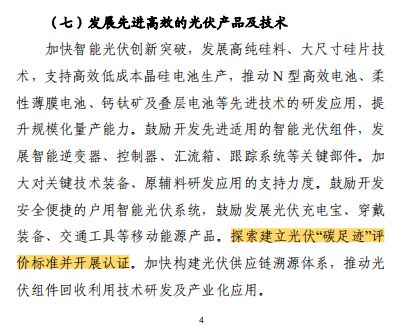 ▲2022年8月工信部公開發(fā)布《關于推動能源電子產(chǎn)業(yè)發(fā)展的指導意見(征求意見稿)》提出:要發(fā)展先進高效的光伏產(chǎn)品及技術,探索建立光伏“碳足跡”評價標準并開展認證