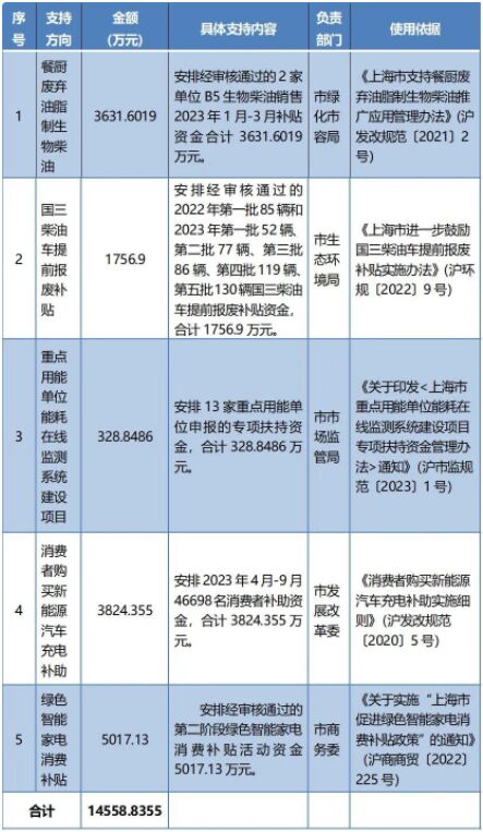 上海市2023年節(jié)能減排專項(xiàng)資金安排計劃(第二批)發(fā)布啦!支持方向?yàn)?span style="font-weight: bold;">餐廚廢棄油脂制生物柴油、國三柴油車提前報廢補(bǔ)貼、重點(diǎn)用能單位能耗在線監(jiān)測系統(tǒng)建設(shè)項(xiàng)目、消費(fèi)者購買新能源汽車充電補(bǔ)助、綠色智能家電消費(fèi)補(bǔ)貼等5項(xiàng)工作,計劃下達(dá)節(jié)能減排專項(xiàng)資金14558.8355萬元,詳見↓