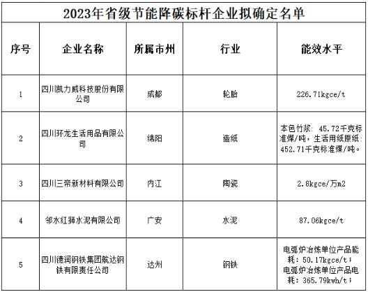 四川省經(jīng)濟和信息化廳公示2023年省級節(jié)能降碳標桿企業(yè)擬確定名單,擬將四川凱力威科技股份有限公司等5家企業(yè)確定為2023年省級節(jié)能降碳標桿企業(yè)。
