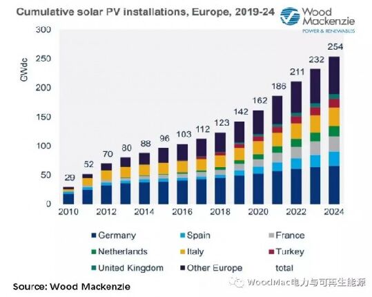 歐洲漫長(zhǎng)的“光伏嚴(yán)冬”已經(jīng)結(jié)束。 根據(jù)Wood Mackenzie(伍德麥肯茲)電力與可再生能源的最新研究《歐洲光伏市場(chǎng)展望》,在經(jīng)歷了多年的光伏安裝容量低迷后,預(yù)計(jì)歐洲新增光伏容量將于未來(lái)3年內(nèi)實(shí)現(xiàn)翻番,達(dá)到約每年新增20GW 年的水平,裝機(jī)總?cè)萘繉⒊^(guò)250GW。 德國(guó)作為全球風(fēng)電風(fēng)電最成熟的市場(chǎng)之一,光伏項(xiàng)目在競(jìng)爭(zhēng)性招標(biāo)會(huì)上的中標(biāo)電價(jià)現(xiàn)已低于陸上風(fēng)電電價(jià)。德國(guó)仍將是歐洲最大的光伏市場(chǎng),預(yù)計(jì)2019年至2024年間將新增21GW容量。與此同時(shí),長(zhǎng)期處于休眠狀態(tài)的西班牙已迅速轉(zhuǎn)變?yōu)槿蛑匾墓夥袌?chǎng),也是企業(yè)可再生能源電力交易的新熱點(diǎn)。與此同時(shí),共有7個(gè)歐洲國(guó)家將安裝至少5GW容量,而18個(gè)市場(chǎng)新增安裝容量將超過(guò)1GW。