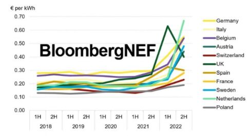 今年高天然氣價(jià)格已經(jīng)反映在消費(fèi)者電價(jià)上。盡管消費(fèi)者電價(jià)的調(diào)整速度比現(xiàn)貨電價(jià)慢,但也已經(jīng)大幅上漲。在英國(guó),政府在今年下半年設(shè)定了平均能源價(jià)格上限(為0.34英鎊/kWh),英鎊兌歐元也走弱,但對(duì)國(guó)家財(cái)政受損以及個(gè)人和企業(yè)承受巨大壓力的擔(dān)憂持續(xù)存在。