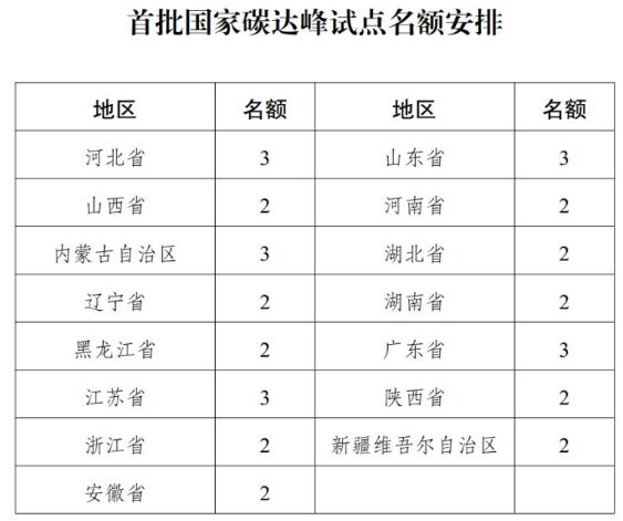 統(tǒng)籌考慮各地區(qū)碳排放總量及增長趨勢、經(jīng)濟社會發(fā)展情況等因素,首批選取15個省區(qū)按照名額分配,建設(shè)35個碳達峰試點城市和試點園區(qū),具體名單由有關(guān)省區(qū)發(fā)展改革委提出,經(jīng)本地區(qū)人民政府同意后,于2023年11月15日前報國家發(fā)展改革委確認。這15個省區(qū)從地域地理分布來看,有華北、華中、華東、西北、東北、東南,從沿海到內(nèi)陸,覆蓋了全國東西南北中各個方位;從區(qū)域經(jīng)濟結(jié)構(gòu)來看,既包擴山東、江蘇、廣東等經(jīng)濟大省,也包括遼寧、河北、黑龍江等制造業(yè)占主導產(chǎn)業(yè)的省份,還包括山西、內(nèi)蒙古和新疆等傳統(tǒng)能源和新能源富集地區(qū)?梢钥闯,碳達峰試點地區(qū)的分配無論是從地理分布、產(chǎn)業(yè)布局還是能源結(jié)構(gòu),都統(tǒng)觀全局,兼顧均衡發(fā)展。