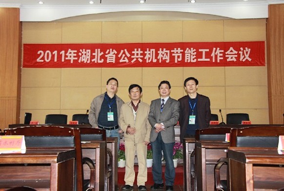 會議期間大明燈業(yè)營銷總監(jiān)文純陽(右二)與湖北省節(jié)能協(xié)會會長王治明(左二)、湖北省節(jié)能公司總經(jīng)理李堂(右一)、副總經(jīng)理朱福祥(左一)在一起合影