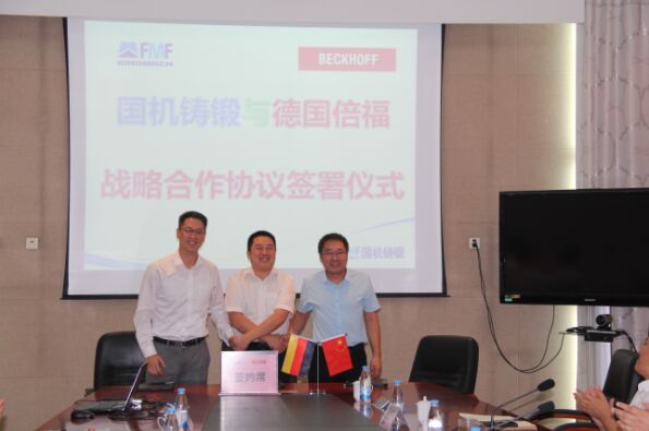 [2018年8月30日,中國(guó)] 2018 年 8 月 30 日,德國(guó)倍福自動(dòng)化有限公司(Beckhoff)與濟(jì)南國(guó)機(jī)鑄鍛機(jī)械有限公司(FMF,以下簡(jiǎn)稱國(guó)機(jī)鑄鍛)在濟(jì)南國(guó)機(jī)鑄鍛會(huì)議廳舉行戰(zhàn)略合作協(xié)議簽約儀式。國(guó)機(jī)鑄鍛總經(jīng)理龐洛明先生、副總經(jīng)理李峰先生;北京科林卓煜科技有限公司總經(jīng)理姚道華先生;倍福中國(guó)運(yùn)營(yíng)總監(jiān)馬興凱先生、銷售總監(jiān)郭禪禪先生、北方區(qū)銷售經(jīng)理孫峰先生等出席了簽約儀式。