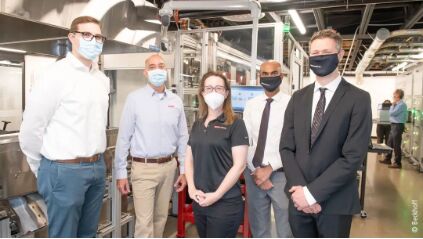 (左起)倍福團(tuán)隊(duì)成員應(yīng)用開發(fā)工程師 John Helfrich、區(qū)域銷售工程師 Charles Usher 和應(yīng)用工程師 Lauren de Rosset 與 Glidewell 公司的自動化部經(jīng)理 Kunal Patil 以及工程副總 David Leeson 密切合作