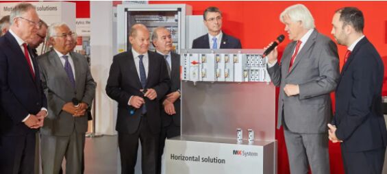 倍福全球總裁 Hans Beckhoff 向德國(guó)總理奧拉夫·舒爾茨和葡萄牙總理安東尼奧·科斯塔展示用于實(shí)現(xiàn)無(wú)控制柜自動(dòng)化的 MX 系統(tǒng)。