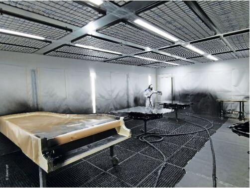 早在 30 年前就與貝森朵夫有過合作的 Berkmann Lackieranlagen 公司再次接受委托,建造新的車間!暗聡娖彳囬g的工藝流程基于全新的設(shè)計方案!变N售&技術(shù)總監(jiān) Rainer Berkmann 解釋道。內(nèi)部裝有通風(fēng)裝置、過濾系統(tǒng)以及熱回收和發(fā)電系統(tǒng)的設(shè)備控制中心,與工廠廠房分開安置在一棟建筑物內(nèi)。這樣就可以在噴漆作業(yè)區(qū)設(shè)立寬敞的工位,以及準(zhǔn)備工位和烘干室。油漆存放和準(zhǔn)備區(qū)也被整合到車間整體設(shè)計方案中。