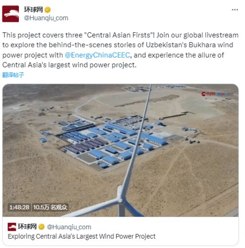 2013年9月,共建絲綢之路經(jīng)濟(jì)帶重大倡議提出,至今已整十年。在這重要?dú)v史節(jié)點(diǎn),環(huán)球網(wǎng)聯(lián)合中國(guó)能建于北京時(shí)間9月25日16:00策劃了“風(fēng)起絲路,電連天涯:探秘中亞第一大風(fēng)力發(fā)電項(xiàng)目”海外直播活動(dòng),通過臉書、推特等海外社交媒體平臺(tái),帶領(lǐng)全球觀眾一起聆聽烏茲別克斯坦布哈拉風(fēng)電項(xiàng)目建設(shè)的幕后故事,近距離感受中國(guó)企業(yè)為推動(dòng)世界綠色低碳發(fā)展做出的切實(shí)行動(dòng),見證“一帶一路”上建設(shè)者們的風(fēng)采。