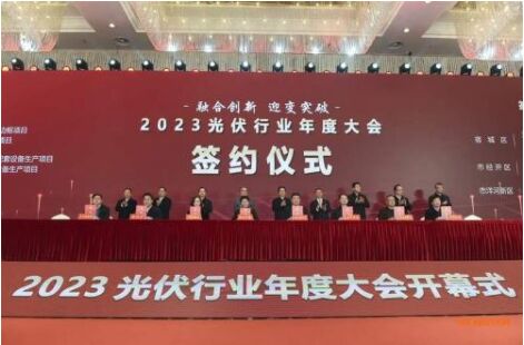 本次大會分為集中活動和分項活動兩個部分。集中活動包括2023光伏行業(yè)年度大會開幕式、2023年中國光伏行業(yè)企業(yè)家座談會(第三屆理事會擴大會議)、2023光伏行業(yè)年度大會主論壇等;分項活動設置了光伏供應鏈配套發(fā)展論壇、光伏系統(tǒng)質(zhì)量安全提升研討會等。開幕式現(xiàn)場,中國光伏行業(yè)協(xié)會、天合光能股份有限公司分別與宿遷市人民政府簽訂了戰(zhàn)略合作協(xié)議。22個項目進行簽約,協(xié)議投資430.16億元,其中50億元以上項目4個。