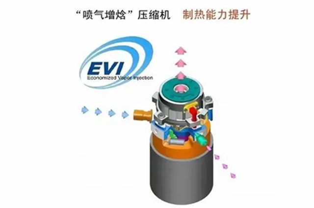 噴氣增焓是由噴氣增焓壓縮機、噴氣增焓技術(shù)、高效過冷卻器組成的新型系統(tǒng)。使得高效的噴氣增焓壓縮機、高效過冷卻器及電子膨脹閥形成的經(jīng)濟器與高效換熱器共同構(gòu)成了高效節(jié)能的噴氣系統(tǒng)。