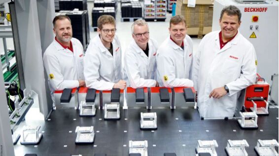 如此精密的系統(tǒng)只能由一個(gè)完整的團(tuán)隊(duì)進(jìn)行設(shè)計(jì)和實(shí)施才能完成(倍福專家團(tuán)隊(duì),左起):Daniel Golz(機(jī)械設(shè)計(jì))、Mathis Blattner(測試柜軟件開發(fā))、Ulrich Brockhaus(系統(tǒng)編程)、Stefan Engelke(測試設(shè)備開發(fā))和 Michael Golz(演示系統(tǒng)部門主管)