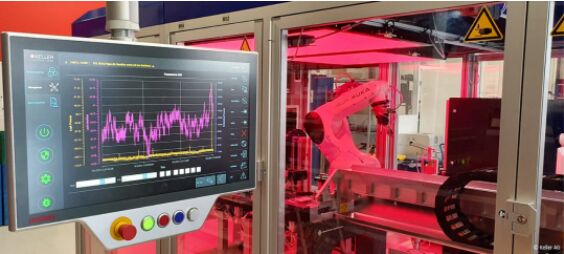 壓印是傳感器隔離膜片生產(chǎn)過程中一個不可或缺的的中間加工步驟,凱樂公司項(xiàng)目經(jīng)理 Florian Wernli 解釋道:“我們的大部分壓力傳感器都封裝在充油不銹鋼外殼中。隔離膜片對于通過油將周圍介質(zhì)的壓力傳輸至傳感器內(nèi)的測量芯片中來說至關(guān)重要!边@就需要通過一臺性能強(qiáng)大的自動壓印機(jī)將隔離膜片壓印成特殊的形狀。凱樂公司開發(fā)與生產(chǎn)裝備部 Bruno Thalmann 補(bǔ)充道:“在經(jīng)過泄漏檢測、用壓縮空氣清潔和熱平衡處理后,我們在同一工藝步驟中使用氫傳感器在高壓條件下進(jìn)行壓印并進(jìn)行確定性泄漏試驗(yàn)。隨后使用圖像處理和人工智能進(jìn)行誤差檢測!眽河C(jī)的核心部分是一臺 KUKA 機(jī)器人,它用作拾放單元,將坯件送至加工位置,并將已完成的工件分成合格品(OK)和不合格品(NOK)兩個部分。