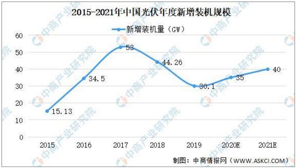 光伏行業(yè)是結(jié)合新能源發(fā)電與半導(dǎo)體技術(shù)的戰(zhàn)略性新興行業(yè),也是受到國家產(chǎn)業(yè)政策和財(cái)政政策重點(diǎn)支持的新能源行業(yè),光伏發(fā)電具有可持續(xù)性、清潔性和無地域限制等突出優(yōu)勢。 (一)發(fā)展?fàn)顩r (1)市場規(guī)模 2019年,受平價(jià)上網(wǎng)政策影響,全國光伏新增裝機(jī)量有所下滑,維持在30.1GW,較2018年下降31.97%。2020年在未建成的2019年競價(jià)項(xiàng)目、特高壓項(xiàng)目,以及新增競價(jià)項(xiàng)目、平價(jià)項(xiàng)目等拉動(dòng)下,預(yù)計(jì)國內(nèi)新增光伏市場將實(shí)現(xiàn)恢復(fù)性增長,預(yù)計(jì)2020年全國新增裝機(jī)量將超過35GW,2021年將達(dá)到40GW。