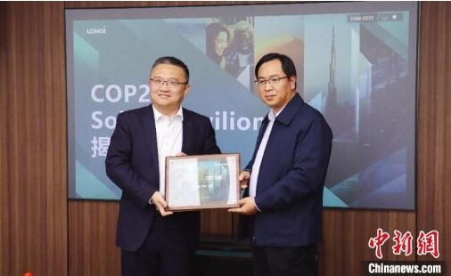 11月21日,中華環(huán)保聯(lián)合會副秘書長李瑞東、隆基綠能品牌總經(jīng)理霍焱在北京共同為Solar+ Pavilion揭幕。(主辦方供圖)