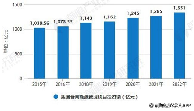中國合同能源管理項(xiàng)目投資額分析預(yù)測 2015年,我國合同能源管理項(xiàng)目投資額為1039.56億元,同比增長8.43%。到了2016年我國合同能源管理項(xiàng)目投資額為1073.55億元,同比增長3.27%。綜合以上因素,預(yù)計2018年我國合同能源管理項(xiàng)目投資額將達(dá)到1143億元,未來五年(2018-2022)年均復(fù)合增長率約為4.26%,預(yù)測到了2022年我國合同能源管理項(xiàng)目投資額將達(dá)到1351億元。