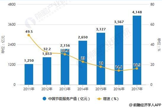 2011-2017年中國節(jié)能服務(wù)產(chǎn)值統(tǒng)計及增長情況