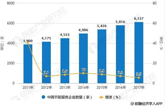 數(shù)據(jù)來源:前瞻產(chǎn)業(yè)研究院整理 2011-2017年中國節(jié)能服務(wù)企業(yè)數(shù)量統(tǒng)計及增長情況