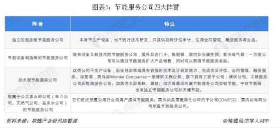 當(dāng)前中國節(jié)能服務(wù)行業(yè)發(fā)展還存在較大的缺陷,首先是規(guī)模小、發(fā)展水平低、市場競爭激烈。其次發(fā)展區(qū)域不均衡,東部地區(qū)遙遙領(lǐng)先;最后是市場競爭出現(xiàn)同質(zhì)化。 未來節(jié)能服務(wù)企業(yè)應(yīng)該在產(chǎn)業(yè)供應(yīng)鏈方向上整合資源,優(yōu)勢互補(bǔ),對具有產(chǎn)業(yè)優(yōu)勢的企業(yè),實現(xiàn)兼并聯(lián)合,實現(xiàn)其產(chǎn)業(yè)優(yōu)勢的快速擴(kuò)張,從而提升企業(yè)應(yīng)對市場的能力。 節(jié)能服務(wù)公司四大陣營,節(jié)能設(shè)備制造商的節(jié)能服務(wù)公司有較大優(yōu)勢 行業(yè)現(xiàn)狀來看,目前中國節(jié)能服務(wù)企業(yè)存在規(guī)模小、發(fā)展水平低,市場競爭激烈、整體的生存狀況較為惡劣的局面。未來在“互聯(lián)網(wǎng)++”戰(zhàn)略全面推薦的時代背景下,城市建設(shè)、園區(qū)建設(shè)將會更加注重以移動互聯(lián)網(wǎng)、物聯(lián)網(wǎng)、云計算、大數(shù)據(jù)等為代表的信息技術(shù)與城市及園區(qū)發(fā)展融合應(yīng)用。在產(chǎn)城融合的發(fā)展趨勢下,節(jié)能服務(wù)公司應(yīng)該有所探索和嘗試,為向智慧化發(fā)展提供思路。分析認(rèn)為,節(jié)能服務(wù)公司大體可以分為四大陣營,如下表所示: