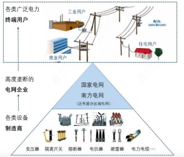 電網(wǎng)產(chǎn)業(yè)鏈下游是廣泛的終端用戶,電網(wǎng)企業(yè)提供輸送電服務(wù),用戶向電網(wǎng)企業(yè)支付電費(目前電網(wǎng)企業(yè)仍然是最主要的售電主體),根據(jù)電價的差異,大致可以將用戶分為:大工業(yè)、一般工商業(yè)、居民以及農(nóng)業(yè)生產(chǎn)四類,其中大工業(yè)和一般工商業(yè)用戶對應的電價高于居民和農(nóng)業(yè)生產(chǎn)用電價。 中游是電網(wǎng)建設(shè)及運營,傳統(tǒng)模式下電網(wǎng)企業(yè)進行網(wǎng)架建設(shè)投資,通過購售電價差,收回投資及賺取收益。 電網(wǎng)的上游包括建設(shè)環(huán)節(jié)的設(shè)備企業(yè)和運營環(huán)節(jié)的發(fā)電企業(yè)。其中電力設(shè)備企業(yè)不僅有硬件設(shè)備,也包括軟件,系統(tǒng)集成等。