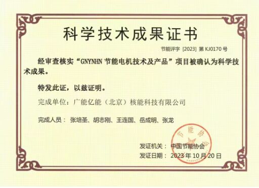 創(chuàng)新驅(qū)動(dòng)發(fā)展,科技成就未來(lái)。廣能億能(北京)核能科技有限公司“GNYNHN節(jié)能電機(jī)技術(shù)及產(chǎn)品”被中國(guó)節(jié)能協(xié)會(huì)認(rèn)定為科學(xué)技術(shù)成果,標(biāo)志著廣能億能核能的節(jié)能電機(jī)技術(shù)邁上了一個(gè)新臺(tái)階。