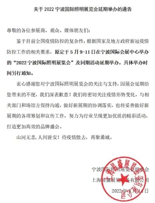 鑒于目前全國疫情防控的復雜性,根據(jù)國家及地方政府新冠疫情防控工作的相關要求,原定于5月9-11日在寧波國際會展中心舉辦的“2022寧波國際照明展覽會”及同期活動延期舉辦,具體舉辦時間另行通知。
